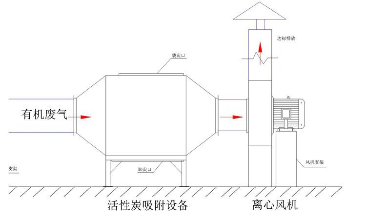 廢氣經過吸附塔內的初效過濾器除去固體顆粒物后,進入塔體,經過活性炭層吸附后,除去氣體中的有機廢氣分子,達到符合排放標準的凈化氣體,經風機排到室外。